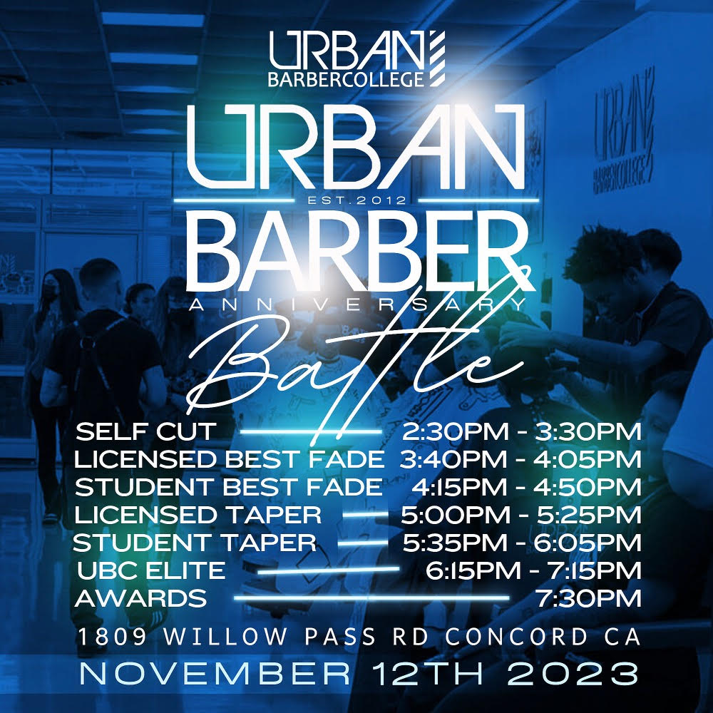 Come join us for the 11th Anniversary of the Urban Barber Battle! Get ready for a day filled with fierce competition, incredible skills, and tons of barbering talent. The event will be held at Urban Barber College located on Willow Pass Road in Concord, CA, USA.